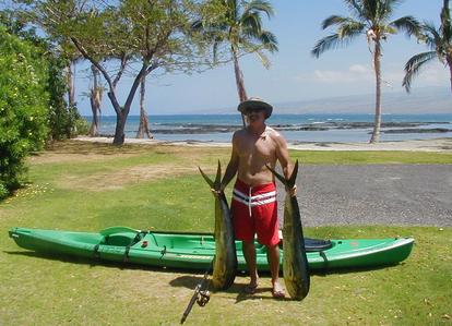 Deep water close to shore allows for Kayak fishermen to go after the same pelagic fish species such as tuna, mahi mahi, and ono (wahoo) that would be targeted by a charter boat. The kayak is a great way to fish for bluefin (omilu) giant trevally (ulua) and a variety of other nearshore game fish. It also provides a great view of the Hawaii's unique coast line.